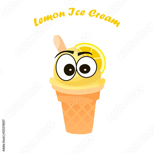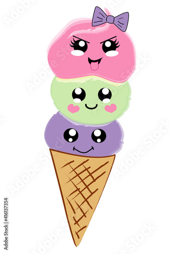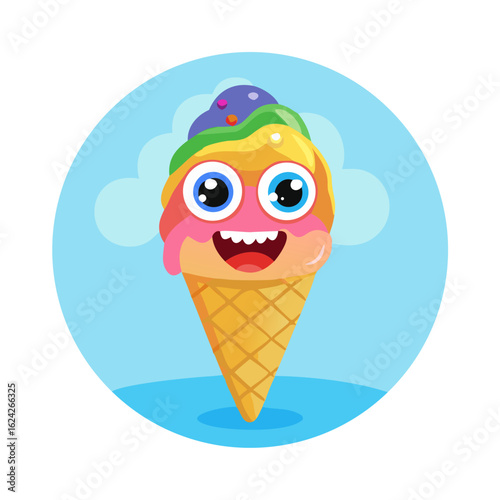 Рожок мороженого с милым мультяшным персонажем в векторе. Забавная вафля с фисташковым мороженым со счастливым лицом, выделенным на белом фоне. Значок сладкой закуски быстрого приготовления