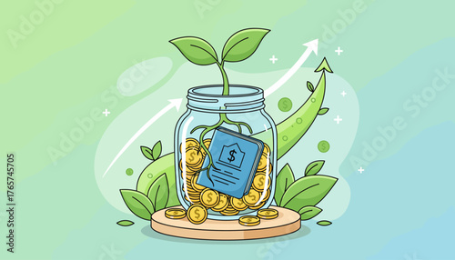Шаблон рекламы чая со льдом, векторная иллюстрация. Макет алюминиевой банки для упаковки холодных безалкогольных напитков с травами, вырезанные из бумаги листья зеленого чая и поля.