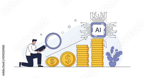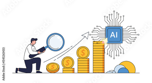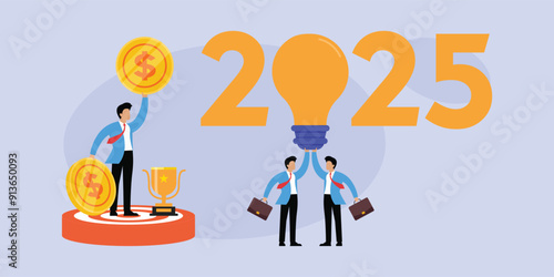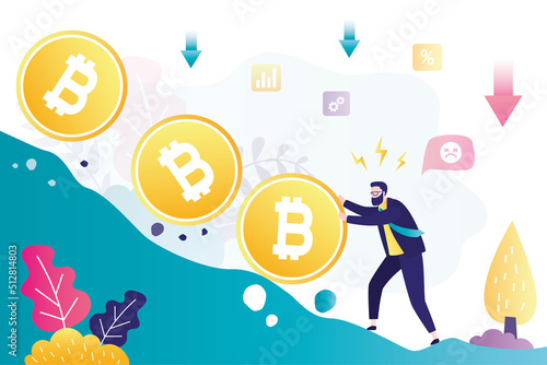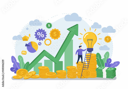 Векторная изометрическая иллюстрация концепции ICO. Бизнесмен с лампочкой проводит презентацию нового криптовалютного проекта группе инвесторов, владеющих монетами доллара, биткоина, эфириума.