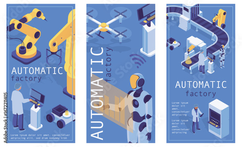 Векторный изометрический плакат по автоматизации и робототехнике, набор шаблонов баннеров. Элементы дизайна конвейерных, сборочных, промышленных и грузовых роботов.