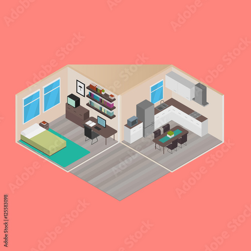Услуги по дизайну интерьера. 3d-модели мебели для гостиной на экране компьютера, чертеж дома, плоская векторная изометрическая иллюстрация. Онлайн-планирование интерьера.