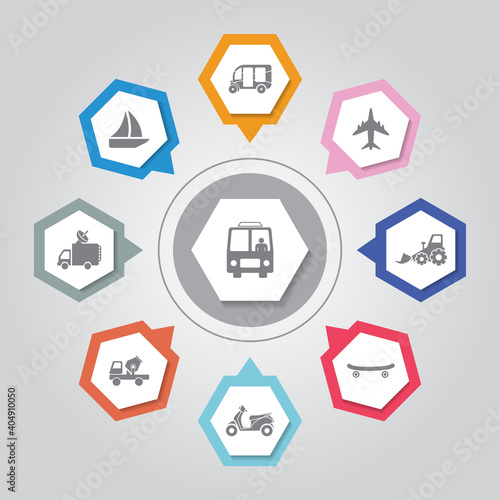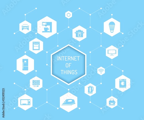 Иллюстрация векторной концепции Интернета вещей. Бытовая техника, бытовая электроника, значки автомобилей и надписи Интернета вещей в шестиугольнике. Элементы дизайна концепции домашней автоматизации, плоский стиль
