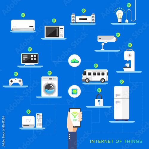 Иллюстрация векторной концепции Интернета вещей. Человеческая рука держит смартфон с надписью IoT на экране. Бытовая техника, значки авто, подключенные к мобильному телефону. Концепция домашней автоматизации, плоский стиль.