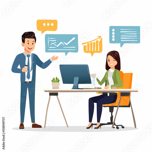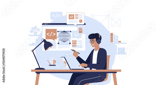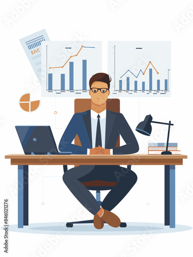 Векторная иллюстрация офисного работника мужского пола, сидящего за столом, использующего компьютер и занимающегося серфингом в Сети, попивая чай. Элемент дизайна в плоском стиле Internet people, значок, выделенный на белом фоне.
