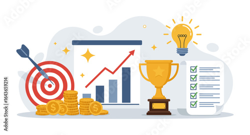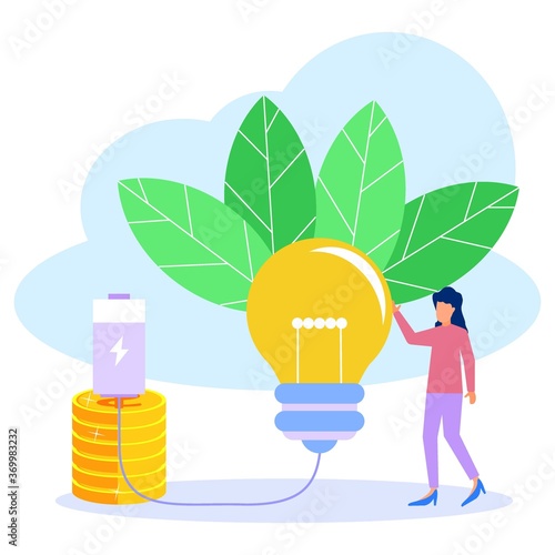 Инвестиции в концепцию возобновляемой чистой энергии векторная плоская иллюстрация. Ветряные мельницы, ветряные турбины, зеленые деревья внутри лампочки и долларовые монеты.
