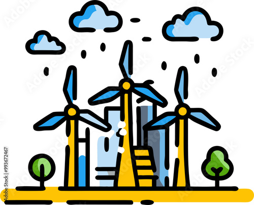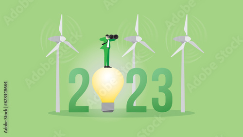 Инвестиции в концепцию возобновляемой чистой энергии векторная плоская иллюстрация. Ветряные мельницы ветряные турбины с зелеными листьями, универсальный символ переработки отходов, человеческая рука, держащая лампочку и долларовые монеты.