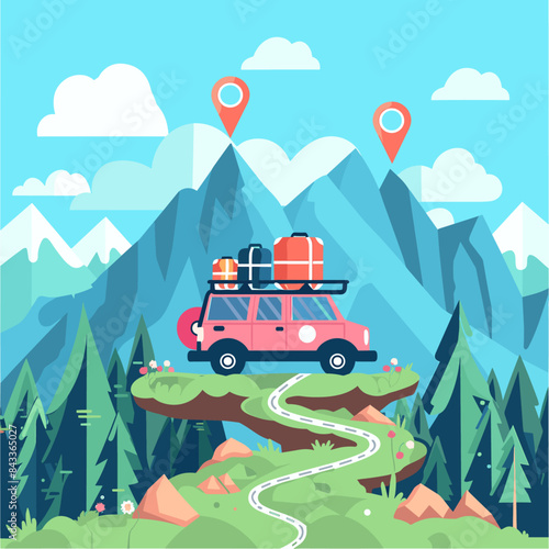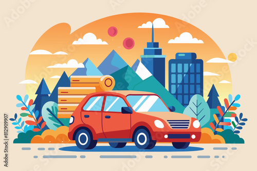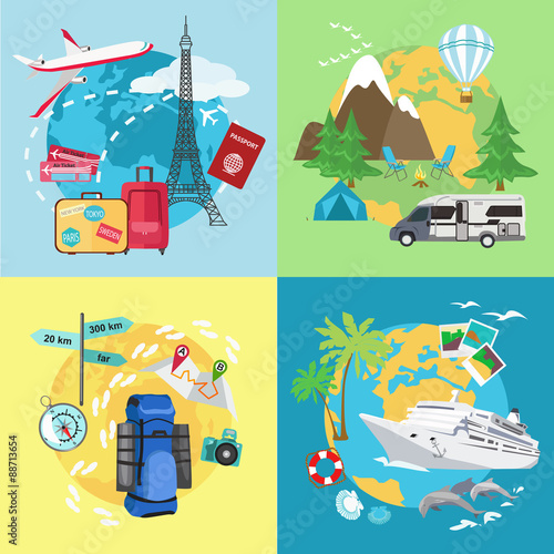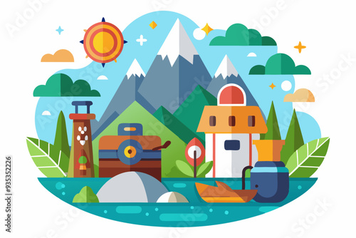 Векторная иллюстрация концепции инвестиций в путешествия. Палатка, фотоаппарат, билеты, солнцезащитные очки, долларовые монеты, горы. Элемент дизайна в плоском стиле для шаблона веб-сайта, плаката, баннера и т.д.