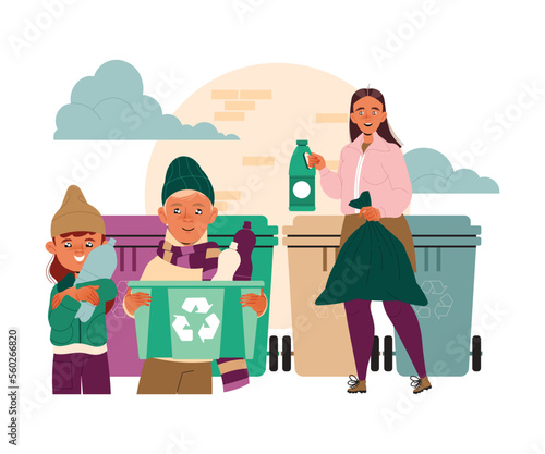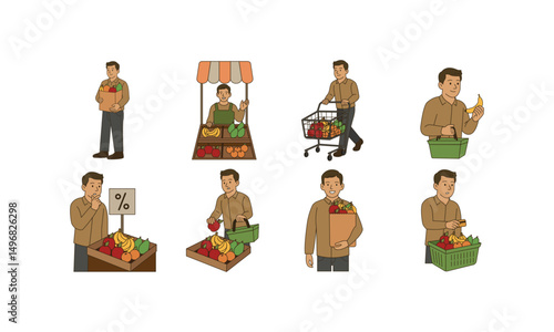 Изолированный набор персонажей из разных людей, собирающих грибы. Пожилая пара, молодые мужчина и женщина в одиночестве, счастливая семья родителей и мальчика, наслаждающаяся сбором урожая в лесу векторная иллюстрация