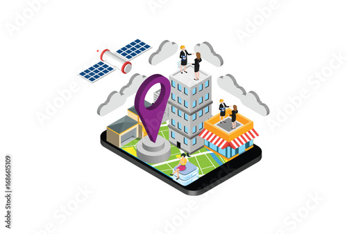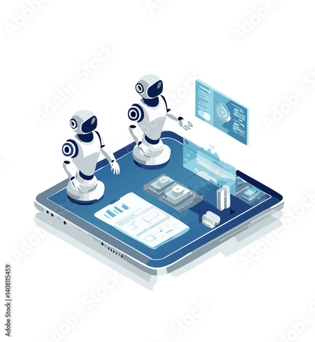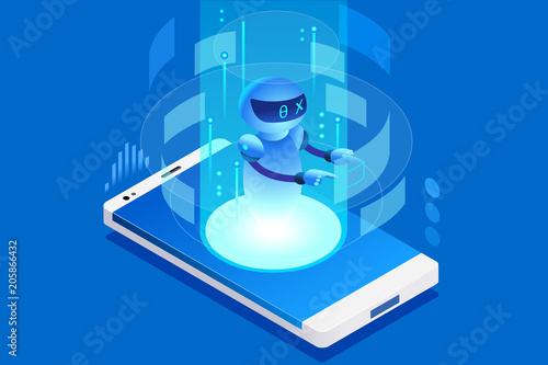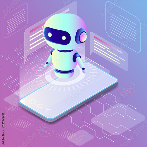 Изометрический робот с искусственным интеллектом на экране смартфона, векторная иллюстрация. Искусственный интеллект, виртуальный помощник, приложение для мобильного телефона с чат-ботом.