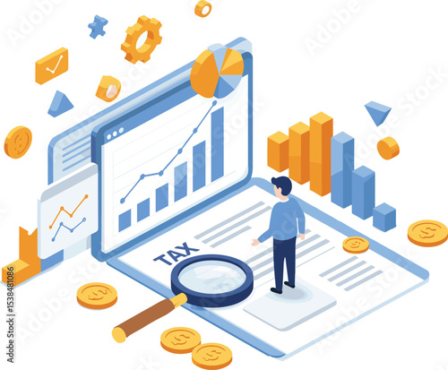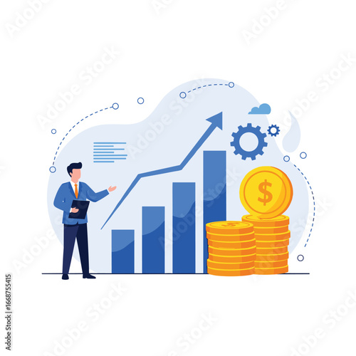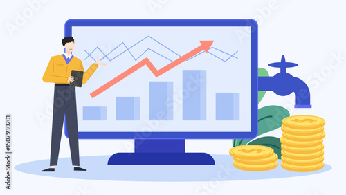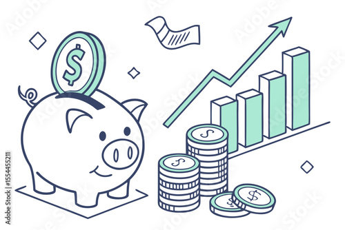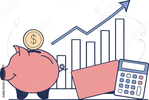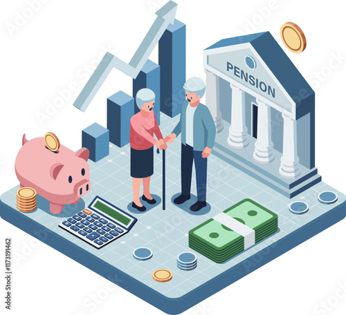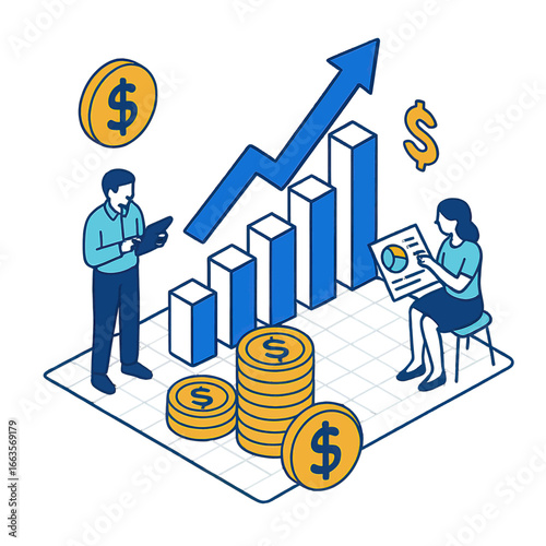 Финансовые вложения. Изометрические банковские карты с людьми, кладущими долларовые монеты в копилку, плоская векторная иллюстрация. Столбчатая диаграмма со стрелкой подъема. Экономия денег, экономичность.