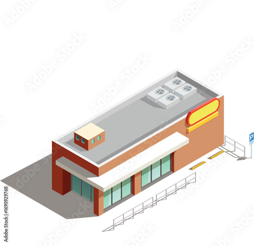 Изометрическое городское здание, современный магазин или офисный экстерьер в 3d-векторе. Иллюстрация значка фасада умного дома для архитектуры городской карты. Коммерческая недвижимость, выделенная на белом фоне
