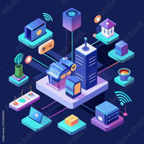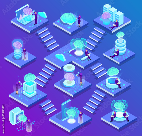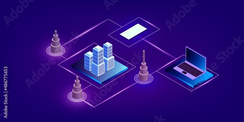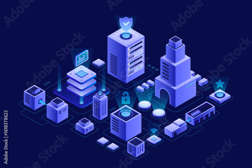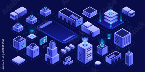Набор изометрических городских зданий, векторная изолированная иллюстрация. Городская современная архитектура, фиолетовое неоновое освещение.