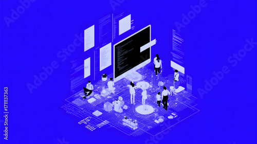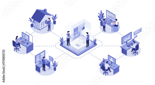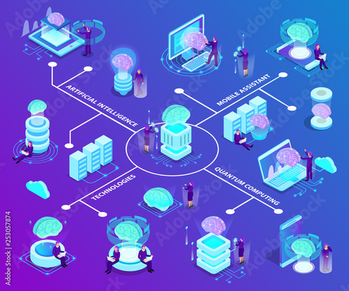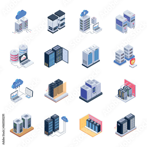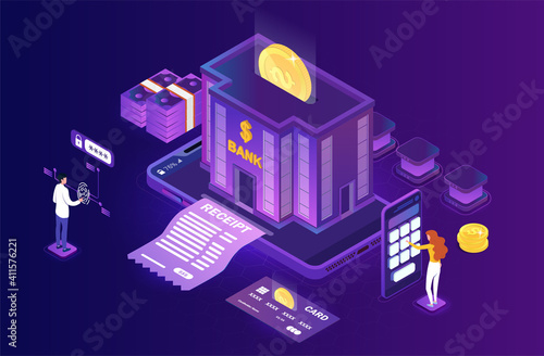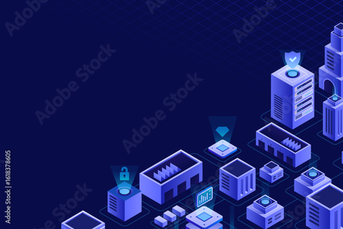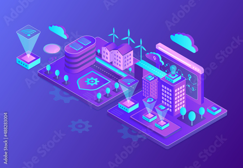 Набор изометрических городских зданий, векторная изолированная иллюстрация. Городская современная архитектура, фиолетовое неоновое освещение.