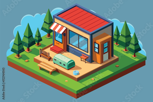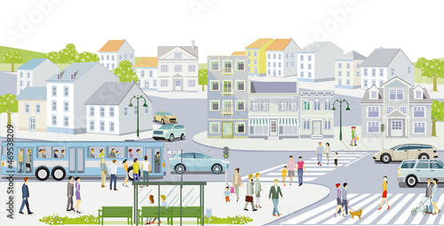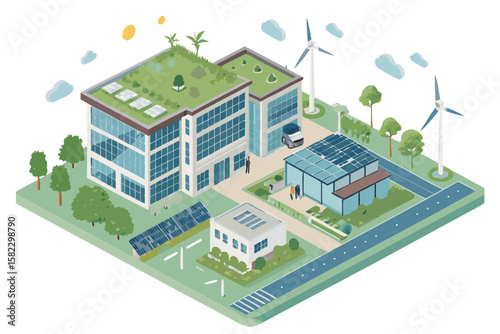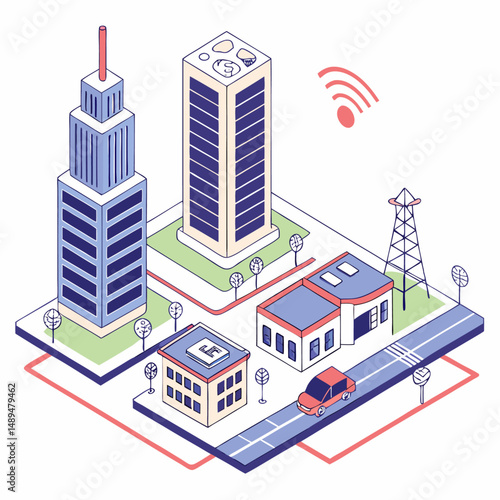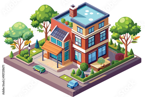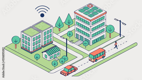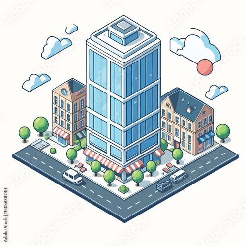 Изометрические городские улицы, жилые и коммерческие здания, общественный транспорт, плоская векторная иллюстрация. Городская архитектура, городской ландшафтный дизайн.