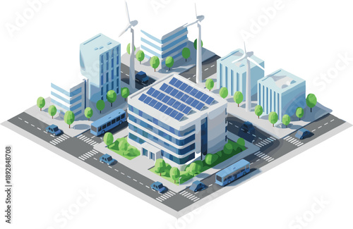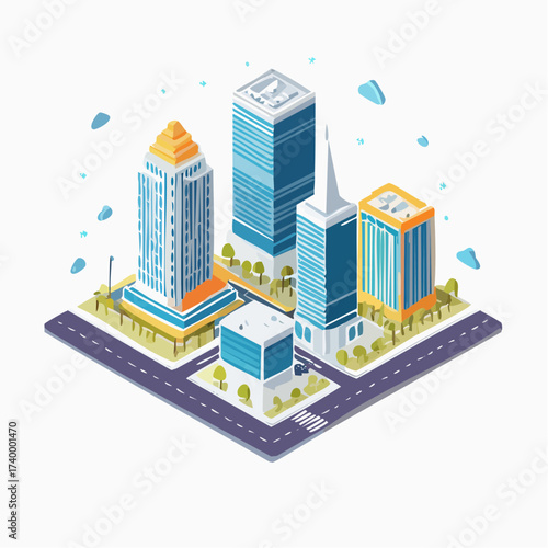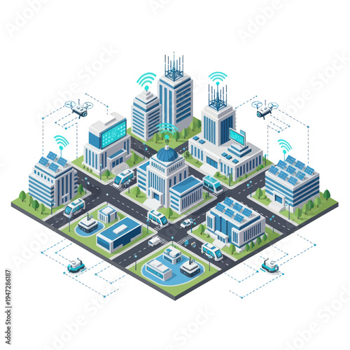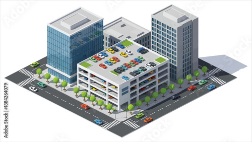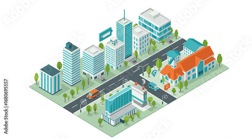 Изометрический город с общественным транспортом, плоская векторная иллюстрация. Автомобиль такси, автобус, скоростной поезд метро. Городской транспорт.
