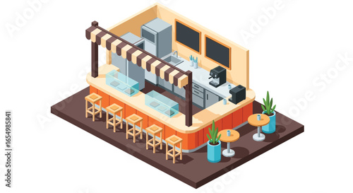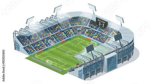 Изометрический хоккейный стадион, игроки и болельщики, плоская векторная иллюстрация. Хоккейная арена, каток, спортивная площадка с трибуной, табло.