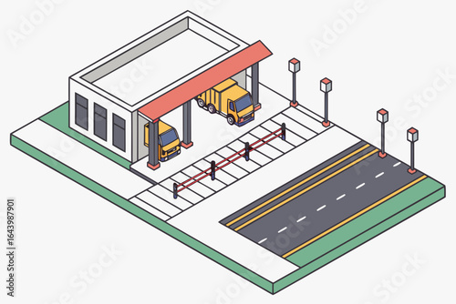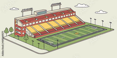 Изометрический хоккейный стадион, игроки и болельщики, плоская векторная иллюстрация. Хоккейная арена, каток, спортивная площадка с трибуной, табло.
