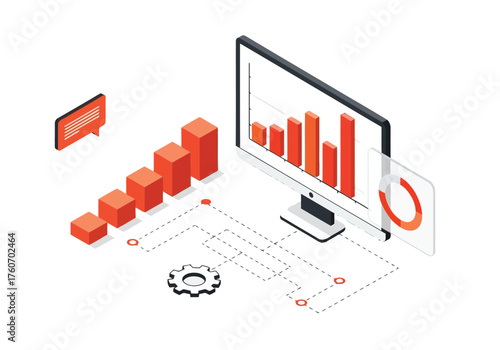Изометрическая корабельная баржа с векторным изображением грузового контейнера. Значок судна-лодки. Перевозка грузов или отходов на белом фоне