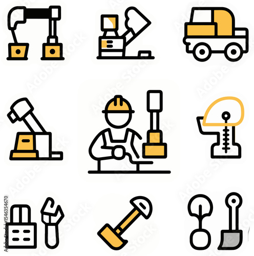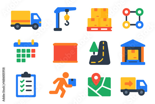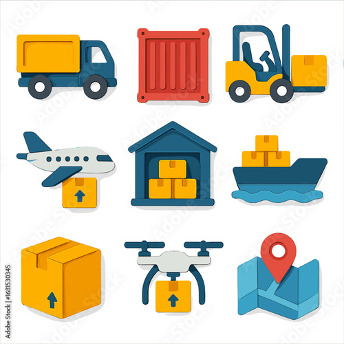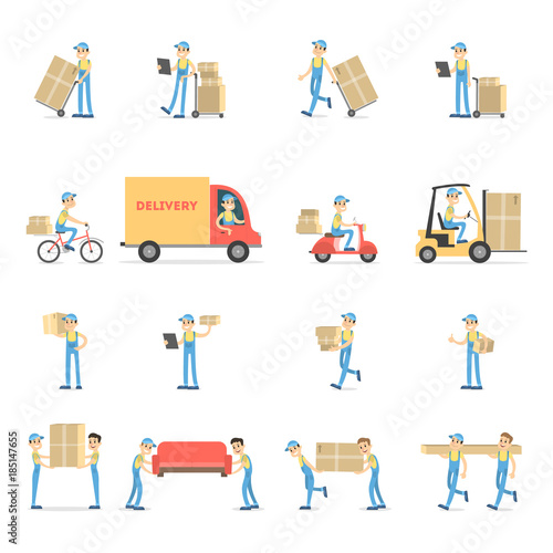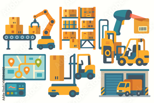 Изометрические работники склада и оборудование, векторная изолированная иллюстрация. Грузовик, вилочный погрузчик, автоматизированная роботизированная рука, картонные коробки, конвейерная лента. Логистические складские услуги, доставка, транспортировка.