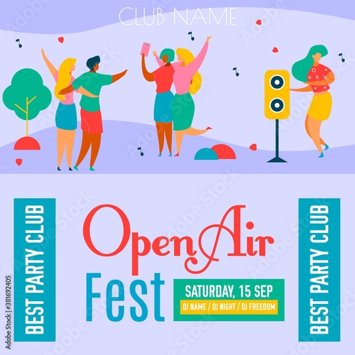 Шаблон баннера векторного плаката джазового фестиваля с персонажами мультфильмов "афроамериканские музыканты джаз-бэнда", играющими на музыкальных инструментах, танцующими и поющими.
