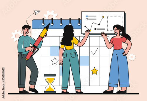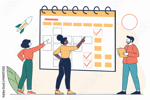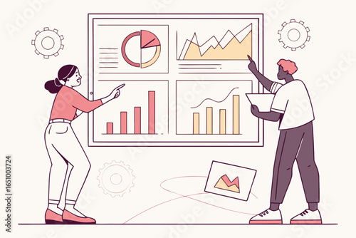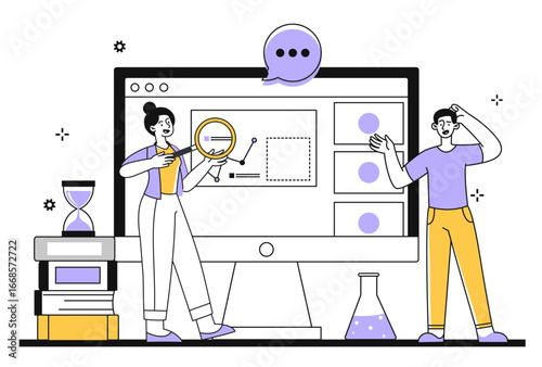 Ювелирный магазин, векторная плоская иллюстрация. Интерьер ювелирного магазина с ювелиром, рассматривающим украшения под увеличительным стеклом, и счастливой парой, покупающей драгоценное кольцо с бриллиантом.