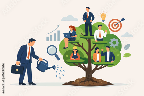 Векторная иллюстрация плоского дизайна концепции работы. Менеджеры кадровых агентств с мультяшными персонажами выбирают лучшего кандидата на работу. Подбор персонала, наем, процесс трудоустройства. Концепция управления персоналом.