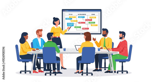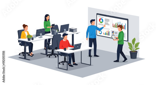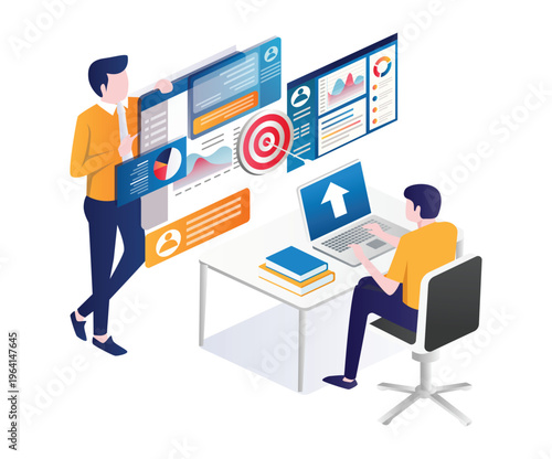 Векторная плоская изометрическая иллюстрация концепции поиска работы. Женщина, сидящая за столом с компьютером и табличкой с вакансией рядом с рекламным стендом вакансий и людьми, ищущими работу.