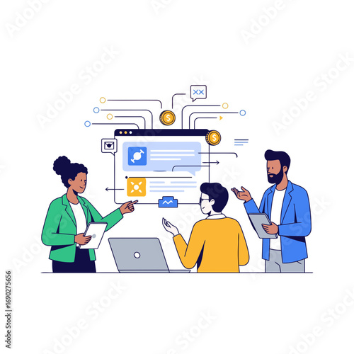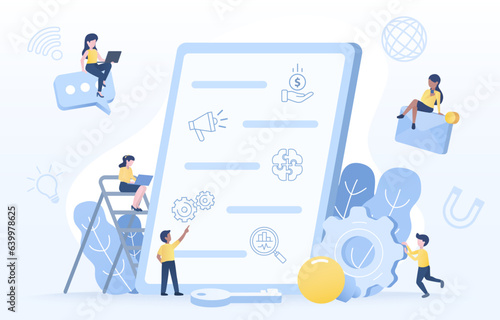 Иллюстрация дизайна в плоском стиле векторной концепции поиска работы. Огромный компьютер и крошечные персонажи ищут вакансию онлайн. Человеческие ресурсы, занятость, наем.