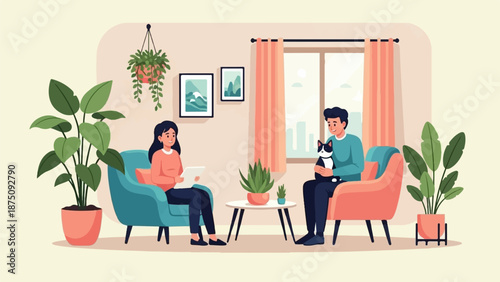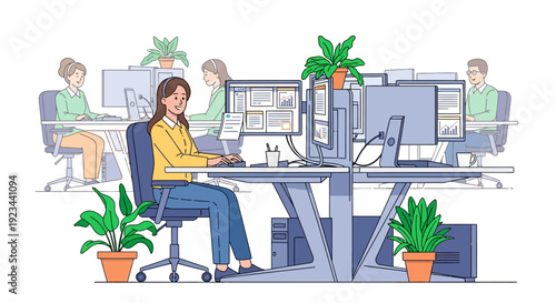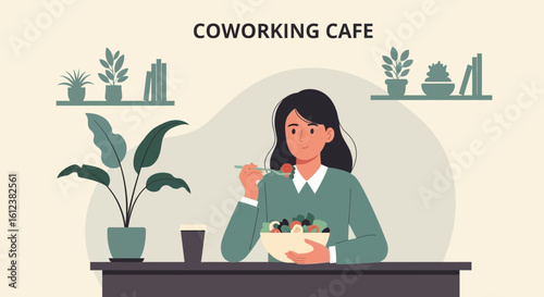 Векторная иллюстрация офисного работника мужского пола, использующего компьютер и пьющего кофе. Концепция работы элемент дизайна в плоском стиле.