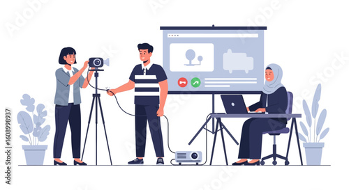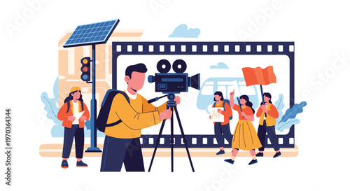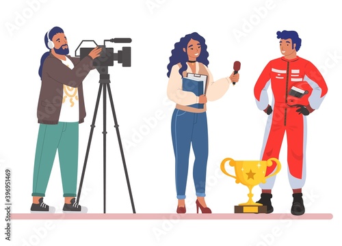 Женщина-журналист, репортер новостей с микрофоном и оператором, снимающим интервью с двумя пожарными, плоская векторная иллюстрация. Прямой репортаж, трансляция последних новостей.