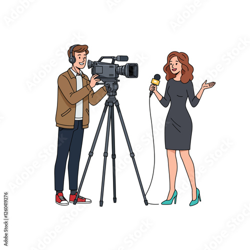 Журналист, тележурналист и съемочная группа оператора транслируют новости векторной иллюстрацией. Концепция репортажной съемки из жизни