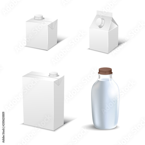 Набор макетов упаковки соков и молочных продуктов, векторная изолированная иллюстрация. Реалистичная белая пустая пластиковая бутылка и картонная упаковка для молока, йогурта, фруктовых и овощных соков и т.д.