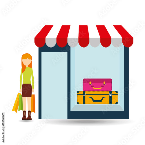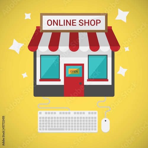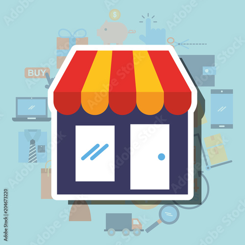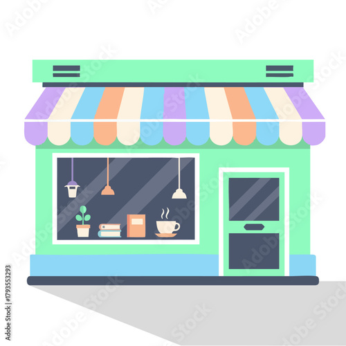 Магазин соков, плоская векторная иллюстрация. Яблочный сок в витрине. Продавец стоит у прилавка. Супермаркет, продуктовый магазин, отдел напитков. Розничный магазин малого бизнеса.