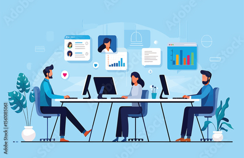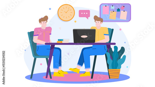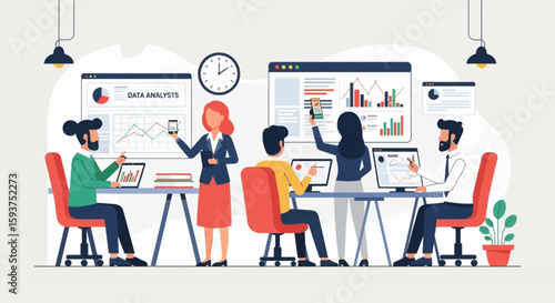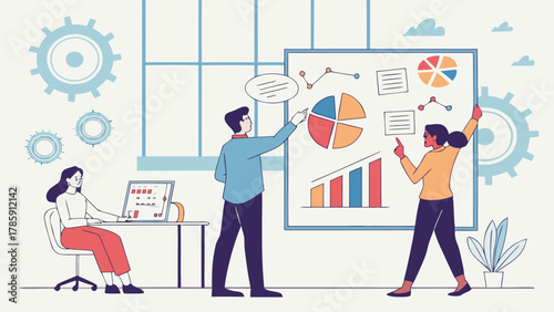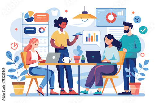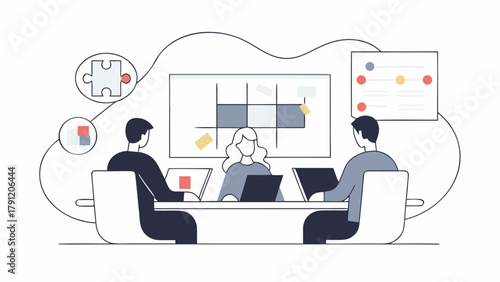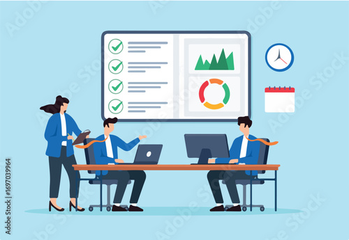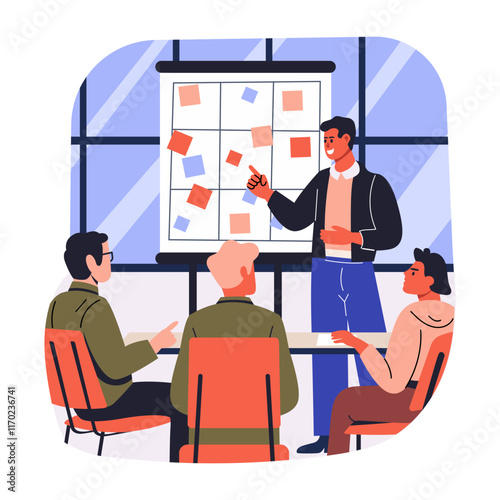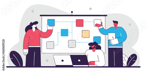 Управление доской Канбан, векторная плоская иллюстрация. Методология Канбана для концепции гибкой разработки программного обеспечения с доской задач scrum и персонажами.