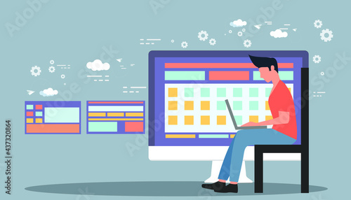 Векторный шаблон веб-сайта Kanban, дизайн веб-страницы и целевой страницы для разработки веб-сайтов и мобильных сайтов. Команда программистов разрабатывает программное обеспечение с использованием гибкой методологии kanban электронная доска задач.