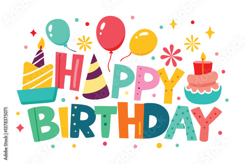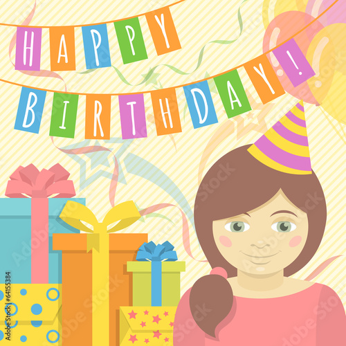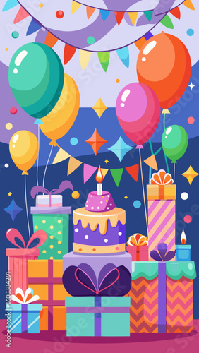 Векторная иллюстрация плаката для празднования детского дня рождения. Мультяшная мать поздравляет дочь с воздушными шарами и подарочными коробками на зеленом заднем дворе дома.