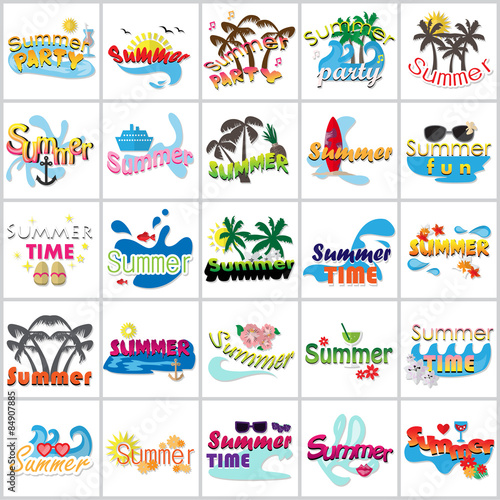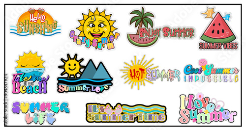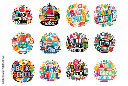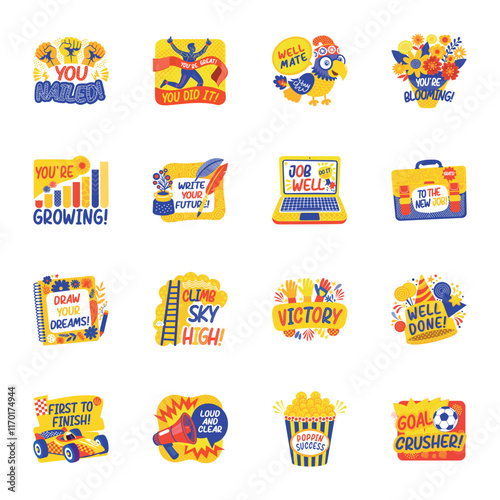 Эмблема детской вечеринки, логотип, набор баннеров, плоская векторная иллюстрация, изолированная на белом фоне. Детская игровая площадка, игровая комната, этикетки для игровых комнат. Детский клуб, оформление игровой зоны.