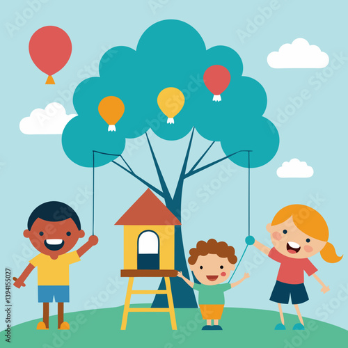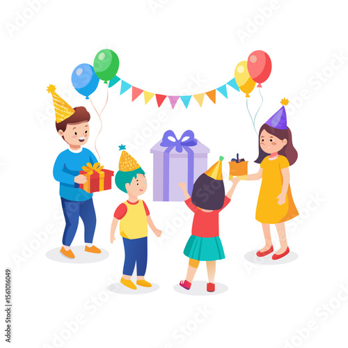 Набор изолированных сцен для детской вечеринки. Счастливые дети, развлекающиеся развлечениями, наслаждающиеся радостным времяпрепровождением векторная иллюстрация. День рождения, фестивальное мероприятие или представление