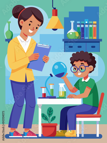 Дети играют с химической колбой и лабораторным оборудованием. Векторная иллюстрация. Набор образовательных и школьных концепций.