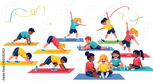 Детская футбольная школа, векторная плоская иллюстрация. Тренер учит детей играть в футбол на поле. Футбольный коучинг, обучение детей футболу.