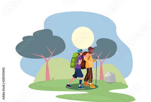 Векторная иллюстрация концепции детского сада. Дети девочка и мальчик идут в дошкольный детский сад со своей мамой. Плоский дизайн.