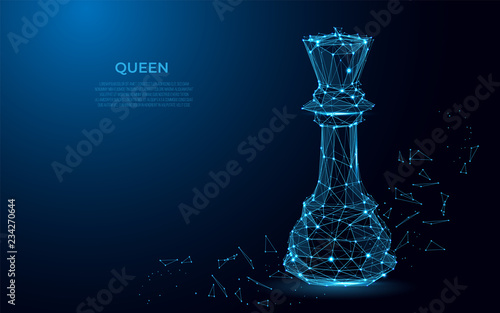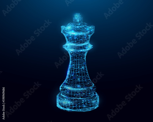 Векторная многоугольная шахматная фигура короля в стиле арт-арта. Низкополигональная каркасная сетка с рассеянными частицами и световыми эффектами на темно-синем фоне. Шаблон дизайна плаката-баннера с пространством для копирования.