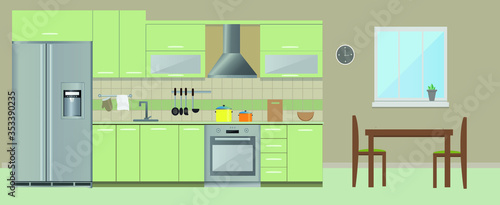 Кухонный конструктор. Реалистичный вектор мебели. 3d-макет интерьера дома. Шкаф, сервант, варочная поверхность и изолированный набор бытовой техники. Оборудование для оформления столовой