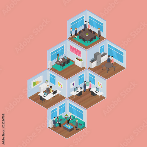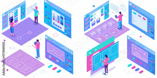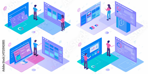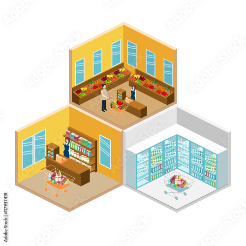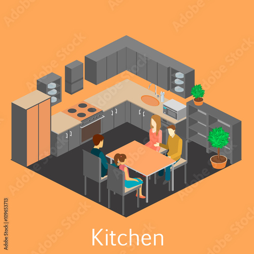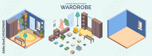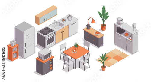 Конструктор интерьера кухни, векторная плоская изолированная иллюстрация. Комнаты с изометрическим вырезом пустые и с мебелью, окном, дверью, бытовой техникой. Создатель кухни.
