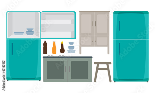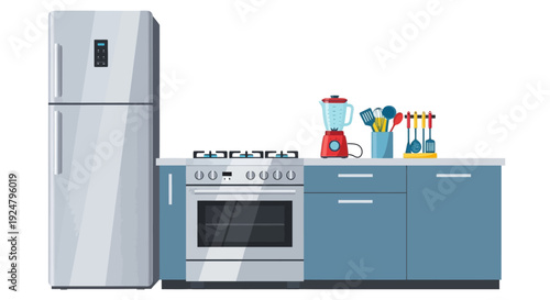 Интерьер кухни и девушка, готовящая ужин, векторная плоская иллюстрация. Современная кухонная мебель, холодильник, плита с духовкой, кухонные принадлежности. Интерьер женской домашней кухни.