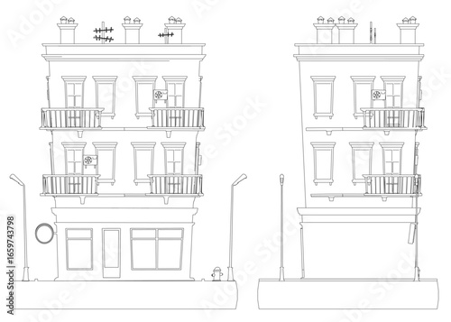 Интерьер кухни, векторная иллюстрация в стиле line art. Кухонная мебель с электрической плитой и духовкой, вытяжкой, раковиной, бытовой техникой, посудой и столовыми приборами.