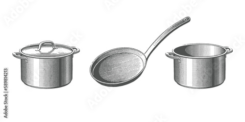 Кухонный горшок и сковорода реалистичный векторный набор. Иллюстрация кухонной посуды с крышками. Кастрюля для приготовления пищи выделена на белом фоне. Кухонное оборудование, кулинарная чаша