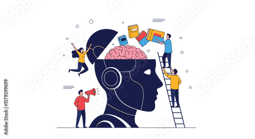 Векторный силуэт человеческой головы в стиле многослойной вырезки из бумаги с взлетающей ракетой, школьными принадлежностями, символами образования и науки. Концепция творческого мышления, знаний и образования.