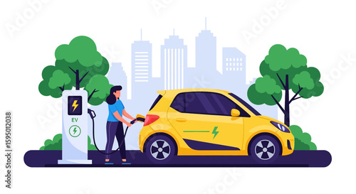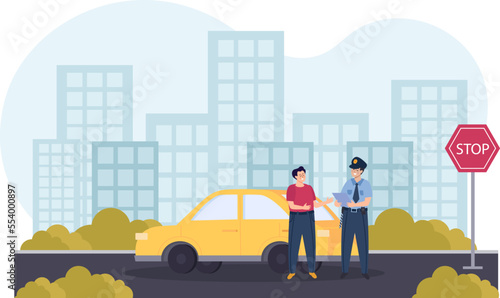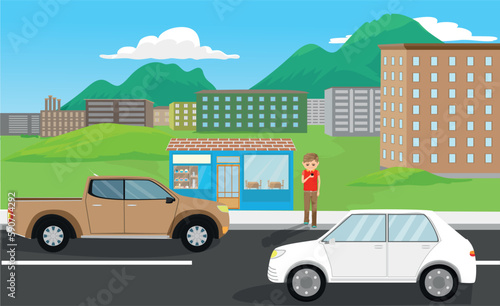 Леди, вызывающая помощь на дороге, автомеханик, меняющий шину, плоская векторная иллюстрация. Аварийная придорожная служба. Страховой случай.