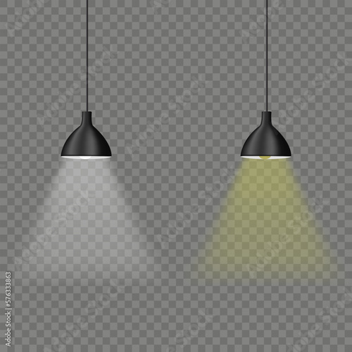 Подвесной потолочный светильник над деревянным столом. Векторная реалистичная иллюстрация черного подвесного светильника, изолированного на прозрачном фоне.